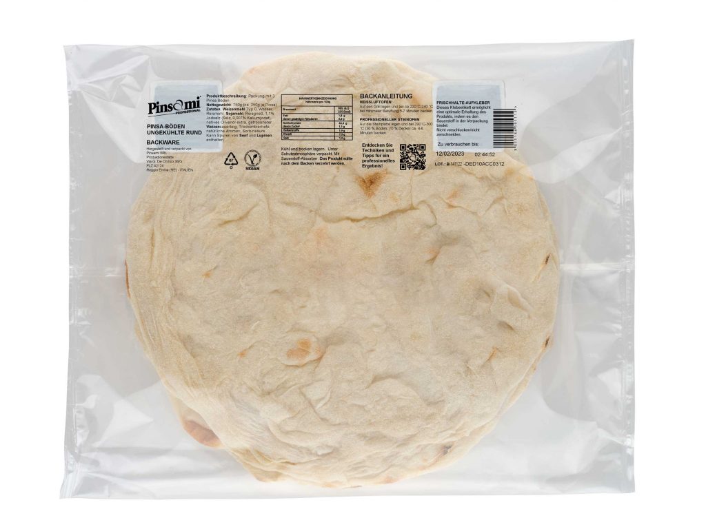 Die original vorgebackenen Pinsa Teiglinge von Pinsami zeichnen sich durch eine besonders hochwertige und ausgewogene Rezeptur mit drei verschiedenen Mehlsorten aus: Weichweizenmehl Typ „0“, Reis- und Sojamehl. Dank dieser 3 Mehlsorten und dass der Teig 24 Stunden geht, lässt sich die Pinsa in nur wenigen Minuten aufbacken und wird wunderbar knusprig und innen luftig leicht. Sie ist deshalb auch bekömmlicher als herkömmliche Pizza und bietet 1001 pikante wie auch süße Rezeptmöglichkeiten. Sie wird in Norditalien hergestellt und handgeformt.